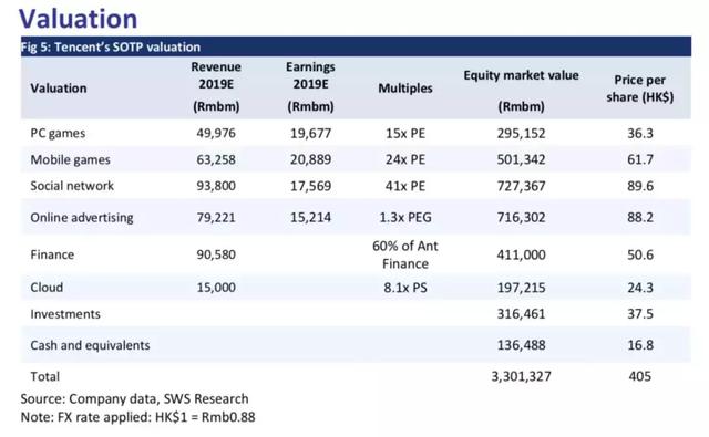 腾讯各类别和总体估值
