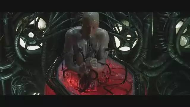 直到这组引发了好一阵墨镜风衣潮流的神秘人出场。尼奥才开始意识到,对方并非胡言乱语的妄人——他生活的所谓世界,其实只是机器人营造的虚拟空间,人类早已成为“电池”一样的奴隶,生活在毫无自由可言的末世农场。