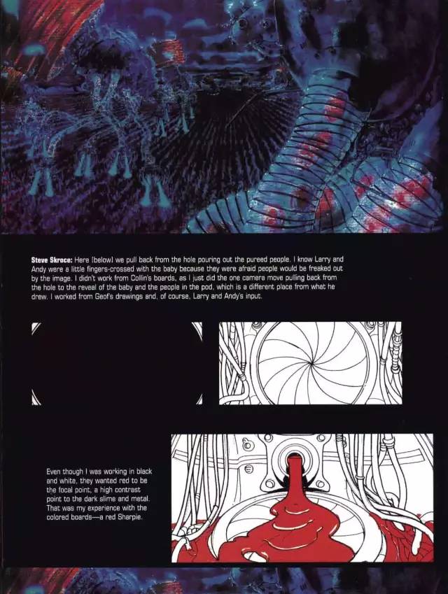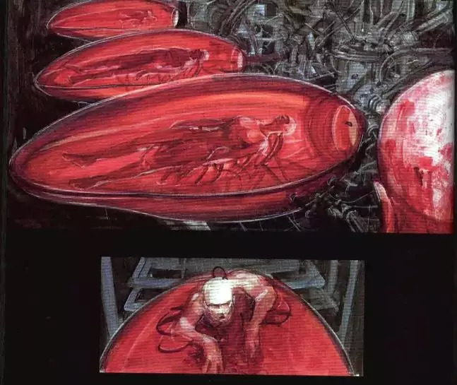 有如来自深海最低点的异形,有着噩梦般的外表,和昆虫一样的枝节,更别提那些培养肉身的舱体像豆荚一般不属于人类世界。由分镜师Warren Manser介绍,“他花了大量时间设计培养皿,试图捕捉尼奥重生的感觉,并加入了一些昆虫材料的感觉,增加透明度,让培养皿看上去不像是人类制造的。”