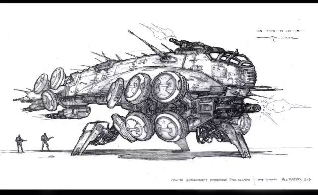 还有电影中主角所在的反抗军小分队,所乘坐的尼布甲尼撒号飞船。这一在洞窟,低空以及废墟中行进的移动堡垒,同时融合了潜艇与水生昆虫的设计理念。从内到外的观感,充满了颓废与消沉的气息,反重力引擎的加入,又使得这艘沉重的铁疙瘩,有了些拒绝屈服的灵动感。