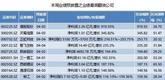 剔除业绩扭亏公司,本周业绩预计最高翻倍的公司有9家,分别是濮耐股份(002225.SZ)、天喻信息(300205.SZ)、正虹科技(000702.SZ)、智飞生物(300122.SZ)、跃岭股份(002725.SZ)、三一重工(600031.SH)、西部建设(002302.SZ)、通源石油(300164.SZ)、柳工(000528.SZ)。
