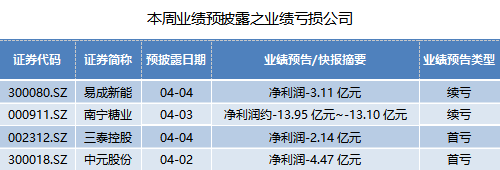 此外,本周还有四家公司已预计公司去年出现亏损,其中三泰控股(002312.SZ)、中元股份(300018.SZ)为首亏,易成新能(300080.SZ)、南宁糖业(000911.SZ)为续亏。