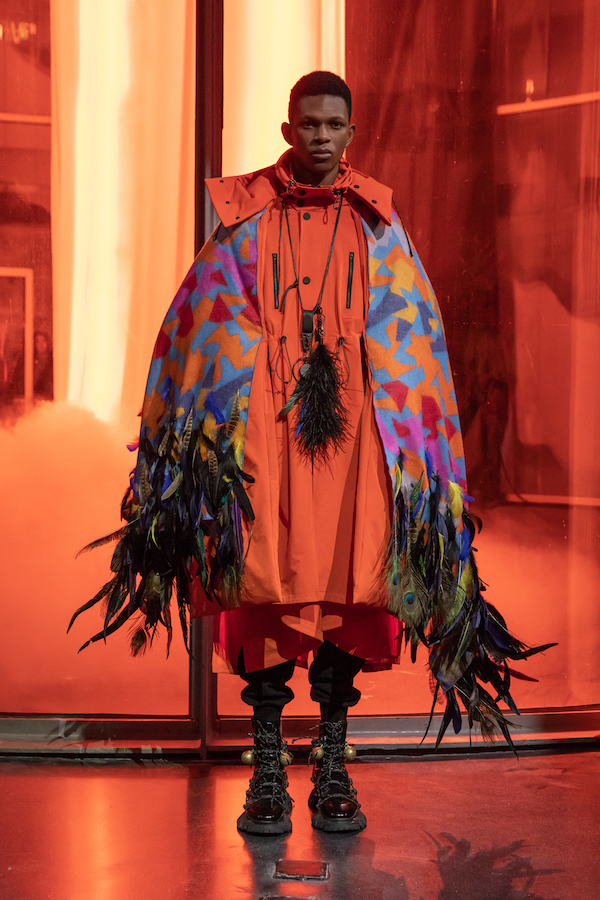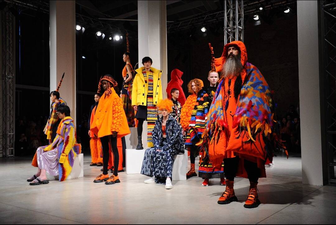 开场后,男女模特身着或红色,或橙色,或明黄,或藏青等高饱和色调的2019秋冬季服装,或在旋转梯上下,或在圆形秀场内部来回穿梭走动。是的,Angle Chen本季在设计上大胆借鉴西部阿坝藏区古老的羌族文化,以表达对游牧民族文化的敬佩和赞叹。
