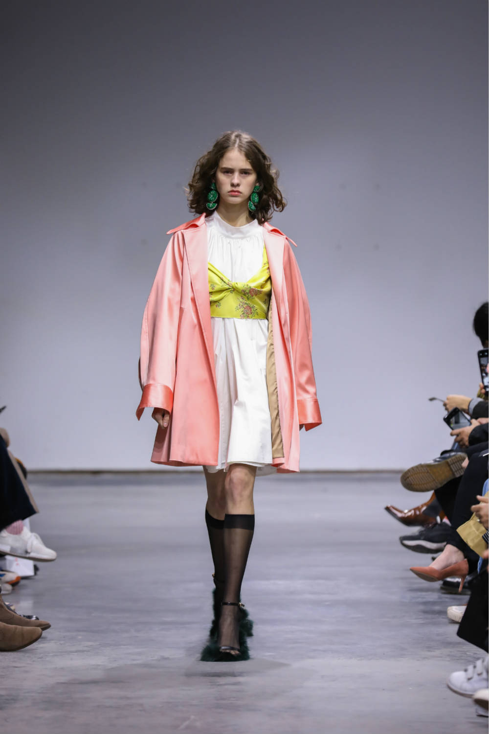 Ming Ma2019秋冬本季没有让我们失望。该系列在一个纯白色极简的长方形空间展开。作为观者,我唯一能做的是把双目聚焦在身着华服、面容各异的模特身上。本季的设计有一个非常鲜明的特点:强烈的复古1920年代女性着装风格与明快艳丽(粉红、明黄、藏青、鲜红等)的高饱和度色块相撞。