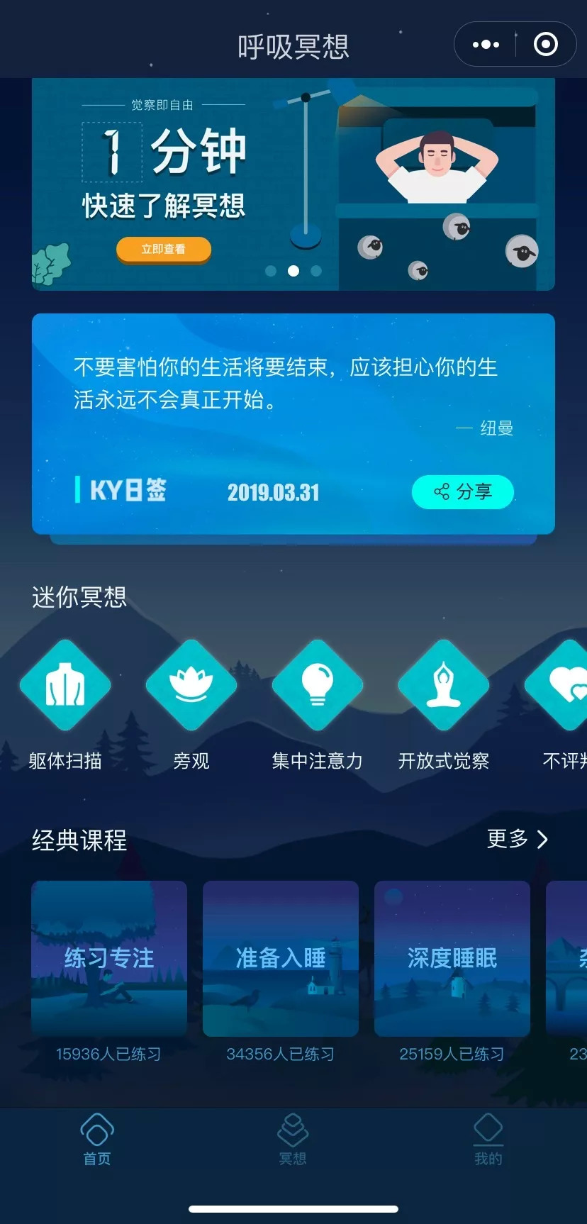 关注中国年轻人焦虑状态和心理需求的泛心理学社区Know yourself(以下简称KY)去年11月通过小程序在自己的内容矩阵上线了“呼吸冥想”,提供冥想课程和一些更简单的、工具化的冥想操作指南。他们的650万公众号用户能够从菜单栏直接进入,按照指导进行一些时长较短——一般在十分钟左右——的冥想练习。