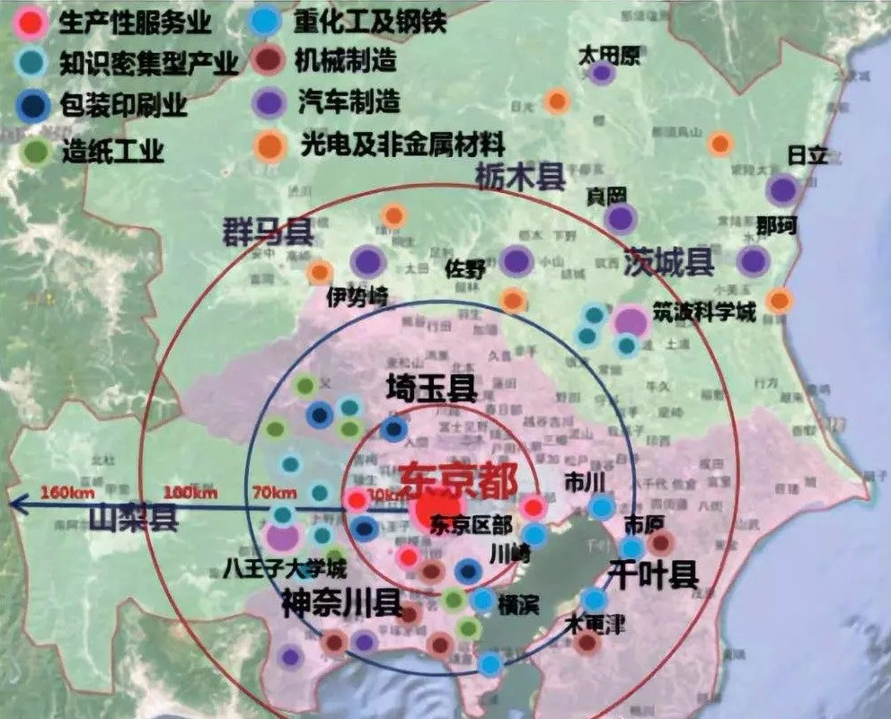 通过这种疏解,也给东京外围的环核心城市带带来了城市升级的机会。这样以来,东京和其外围环核心城市带产生了互动,东京都市圈“点—线”的空间圈层结构初步成型,初具都市圈的雏形。