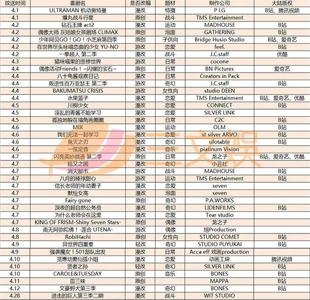 据不完全统计,截止到3月29日,已确定上线的4月新番动画有40部,国内版权方引进了其中的25部,与上季度的30部相比相对持平。具体到平台来看,B站依旧保持着新番引进的榜首位,在新番版权竞争中拿下了17部独播动画和5部合播动画;优酷获得了《一拳超人第二季》的独播权和两部新番的合播权;爱奇艺获得了《偶像活动Friends!~闪耀的宝石~》的独播权和三部新番动画的合播权;腾讯视频获得了《贤惠幼妻仙狐小姐》的独播权和两部新番动画的合播权。