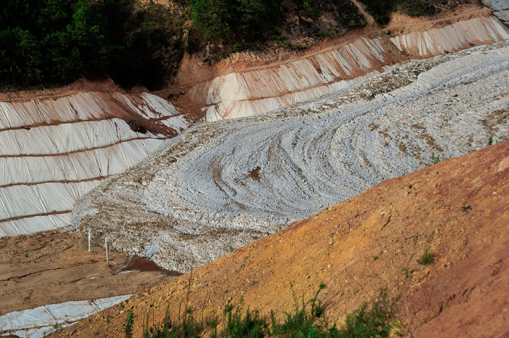 铅锌冶炼渣库两侧的土坡低处用塑料层覆盖,作为防渗保护层。形成泥石流状的矿渣堆倾泻而下。随着冶炼渣的堆积,两侧的植被将逐渐被淹没。@Greenpeace/林克