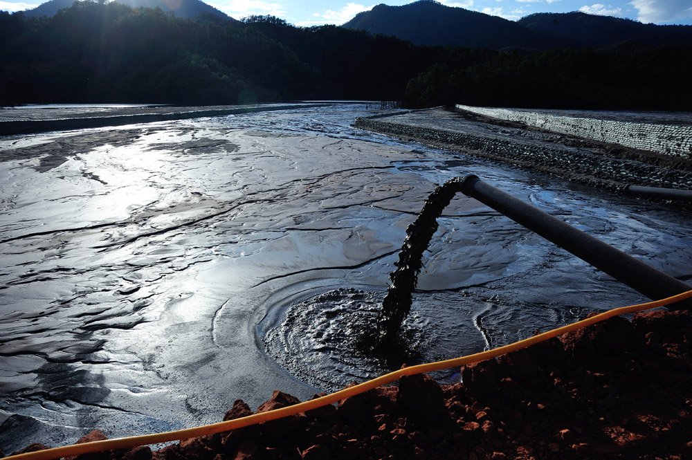 哨上尾矿库是选矿厂排放尾矿废水的地方,位于几座山中的谷地,一侧由土石坝堵住,形成一个大型的尾矿池。数十根管子源源不断地向尾矿池排放黑色的泥浆,晾晒、凝固成灰色的泥沼,含高浓度的有毒物质。形成了泥浆状的巨型“毒湖”。@Greenpeace/Young