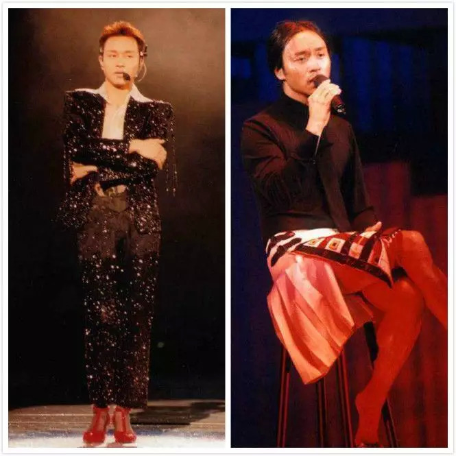 在跨越97演唱会上,张国荣公开与唐先生的恋情,在表演时还穿上了女士红色高跟鞋与男性舞者跳探戈,2000年,他再一次在演唱会上留着长发、穿着中性服装表演。