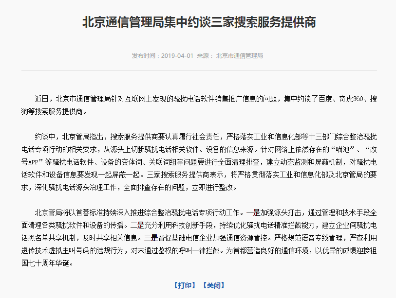 约谈中,北京管局指出,搜索服务提供商要认真履行社会责任,严格落实工业和信息化部等十三部门综合整治骚扰电话专项行动的相关要求,从源头上切断骚扰电话相关软件、设备的信息来源。针对网络上依然存在的“喵池”、“改号APP”等骚扰电话软件、设备的变体词、关联词组等问题要进行全面清理排查,建立动态监测和屏蔽机制,对骚扰电话软件和设备信息要发现一起屏蔽一起。三家搜索服务提供商表示,将严格贯彻落实工业和信息化部及北京管局的要求,深化骚扰电话源头治理工作,全面排查存在的问题,立即进行整改。