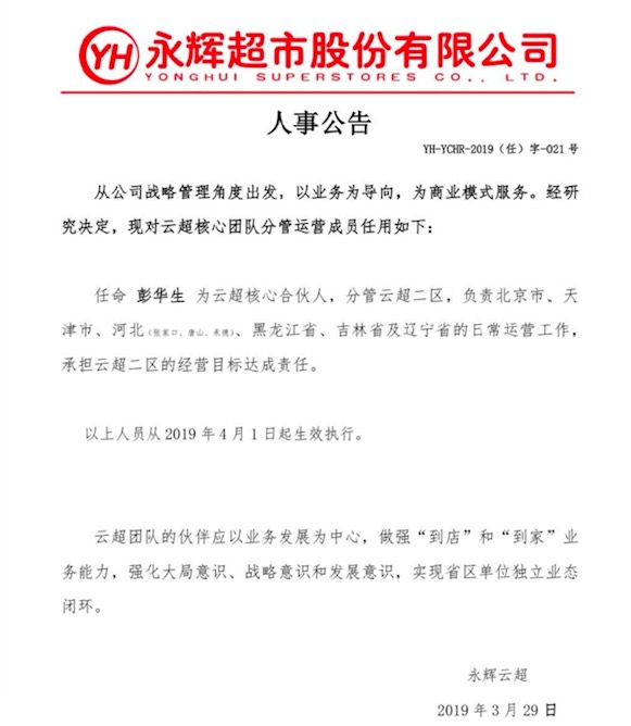 另一份任命通知也证实了该消息的真实性。界面新闻从接近永辉的业内人士处获取的一份人事公告显示,任命彭华生为云超核心合伙人,分管云超二区,负责北京市、天津市、河北(张家口、唐山、承德)、黑龙江省、吉林省的日常运营工作,承担云超二区的经营目标达成责任。