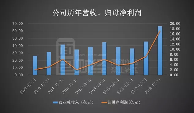 年报显示,2018年,公司实现营业收入66.30亿元,同比上升45.27 %;归母净利润及扣非后归母净利润分别约17.23亿元和16.20亿,同比分别增139.00 %和137.99 %。年度归母净利润增长幅度明显高于营业收入增长幅度。