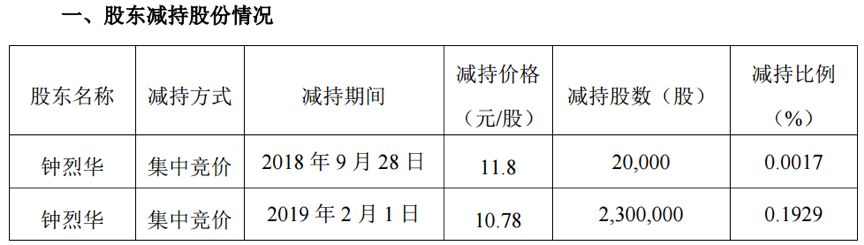 3月12日,公司披露了钟烈华减持计划实施完毕的公告。公告显示,2018年9月及2019年2月,其合计减持232万股,减持参考市值约2503万元,减持因偿还认购2017年公司非公开发行股票的债务融资需求。