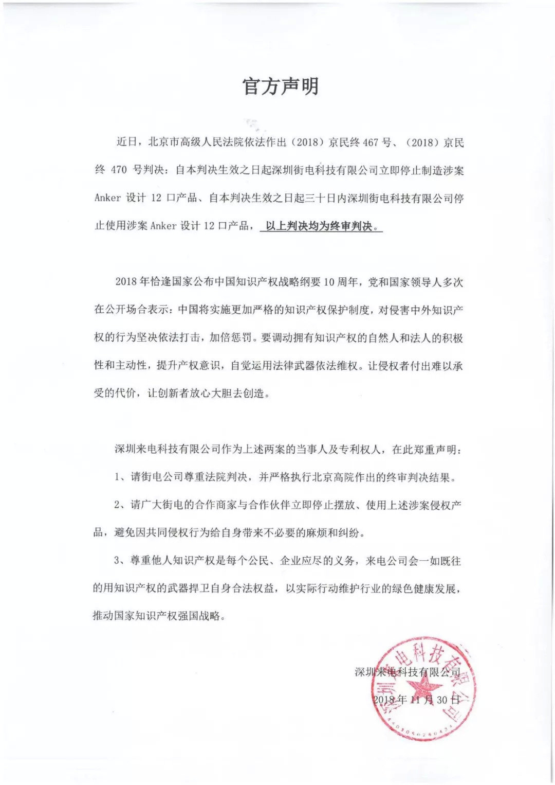 2018年年底,北京市高级人民法院作出终审判决,要求街电停止侵权行为,于判决生效之日起立即停止制造涉案Anker设计12口产品,并赔偿原告来电经济损失共计200万元。