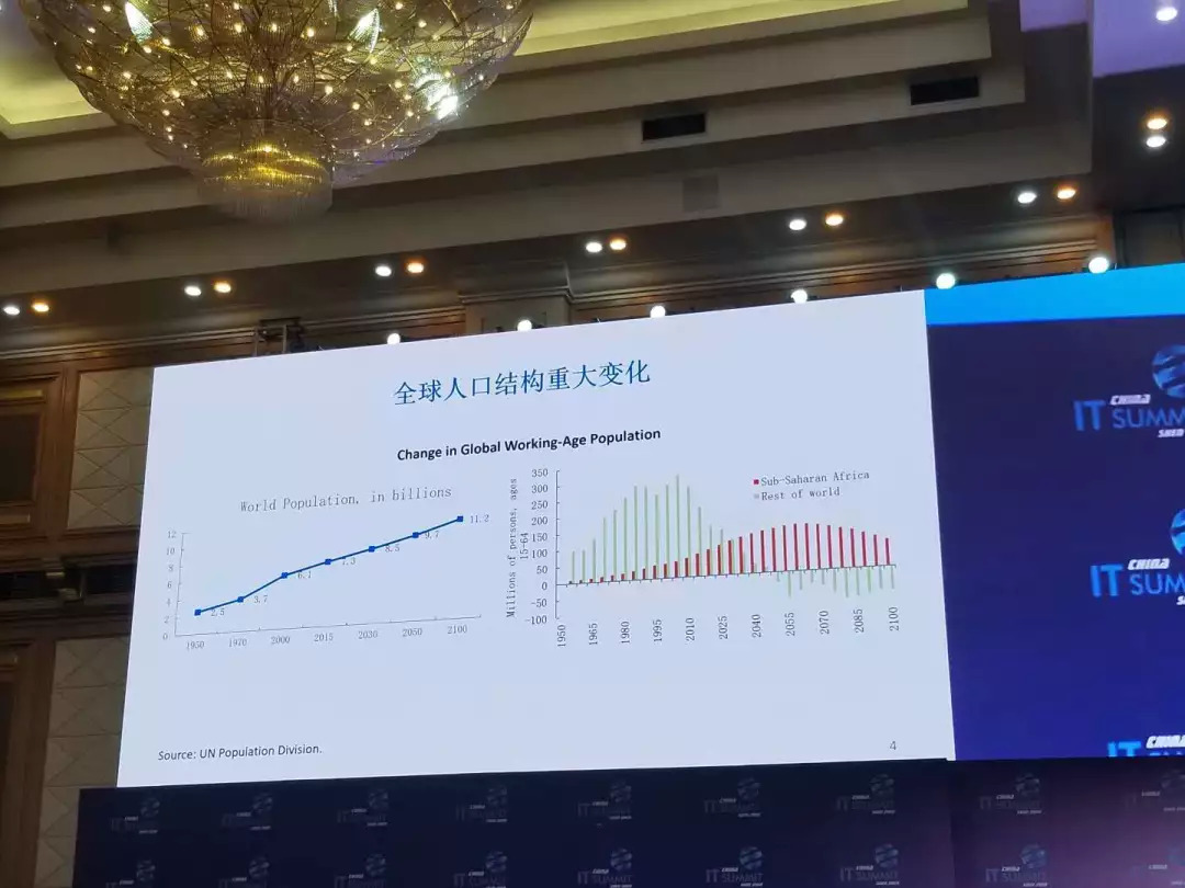 我们可以看到蓝的斜线是全世界人口从今年75亿在连续不断地增长,右边图绿的是发达国家、新兴经济国家劳动力的供给,大家可以看到最高峰恰恰是2008年,以后就逐渐下跌,到2040年左右下降为0,然后一度为负。红线是非洲的劳动增长率,这是不断的上升。