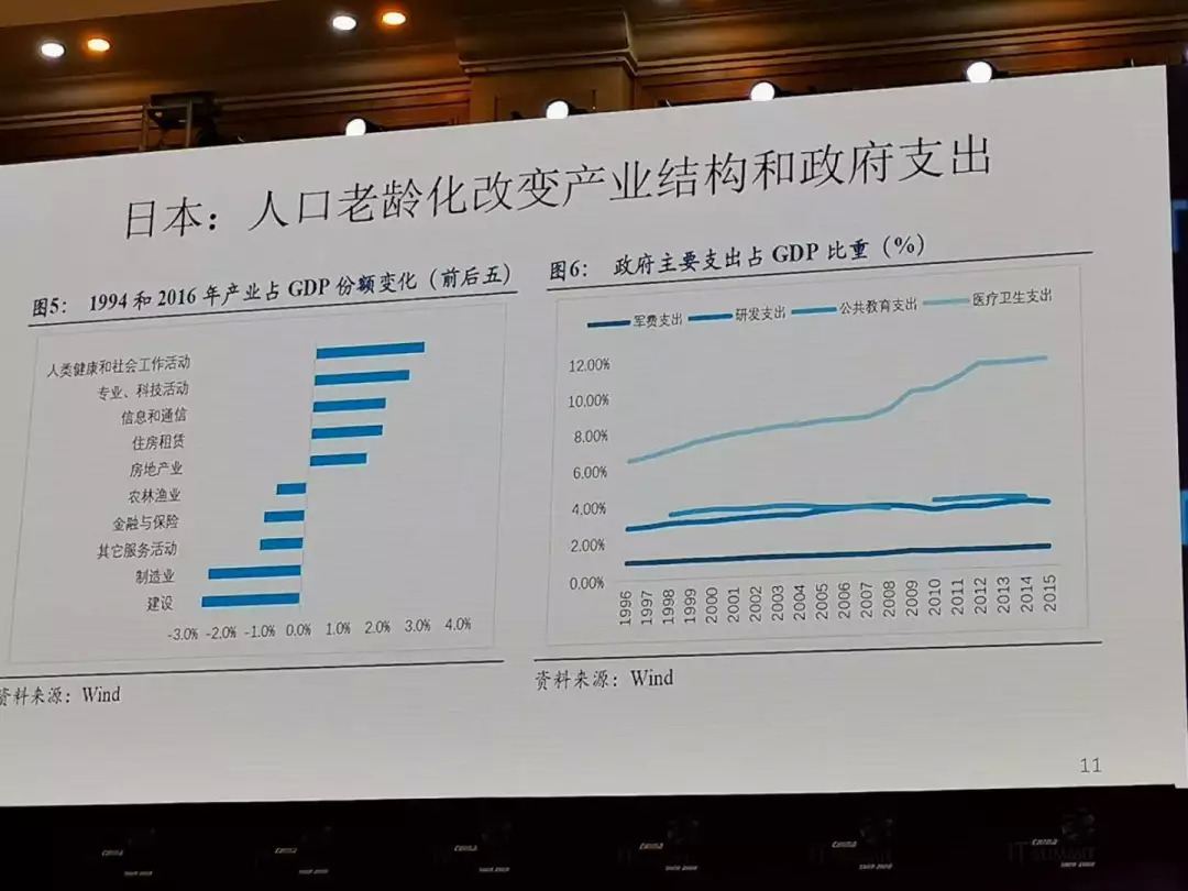 日本是老龄化最早的国家。以日本为案例来看的话,日本在90年代到2016年期间整个产业结构发生了根本变化,整个建筑业、制造业、服务业、金融业都在萎缩,通讯、科技和健康服务业的行业在上升,政府所有的开支都不变,只有卫生医疗支出急剧上升,这都是老龄化走向的一个必然过程。