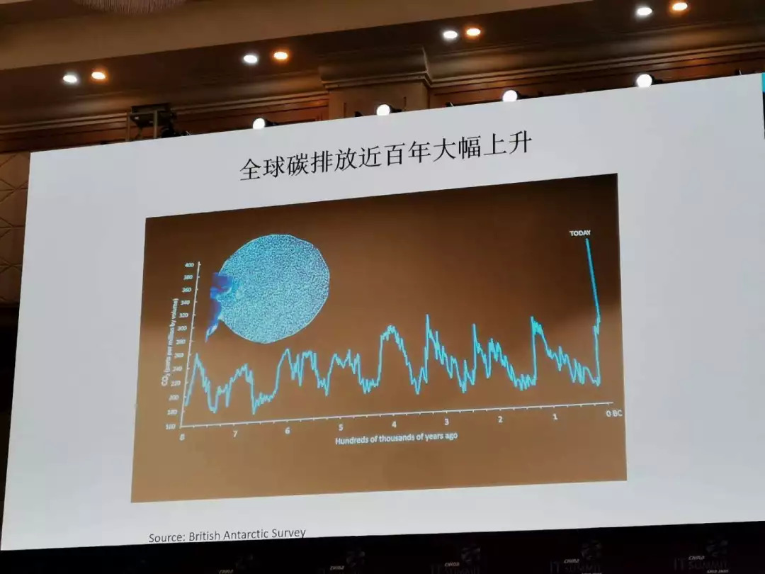 气候变化很重要的原因,这是我们一万年的碳排放,碳排放每一千年经过上升、下降,但是在最近的一千年碳排放急剧上升,这就是人类活动的影响。人类活动引起碳排放的很重要原因是能源,特别是石油能源的消耗急剧上升,所以控制大气变化、气候变化最主要的问题是能源的消耗减少和能源的效率要提高。