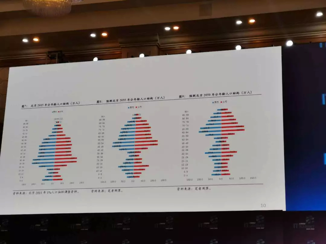 这是北京的人口结构,第一个图基本上是以20岁的人为最大的基础,北京在2035年以50岁的人为基础,是呈三角上升。北京人口结构到2050年以60岁和70岁的人为人口最大的部分,整个老龄化的上升是非常厉害的。