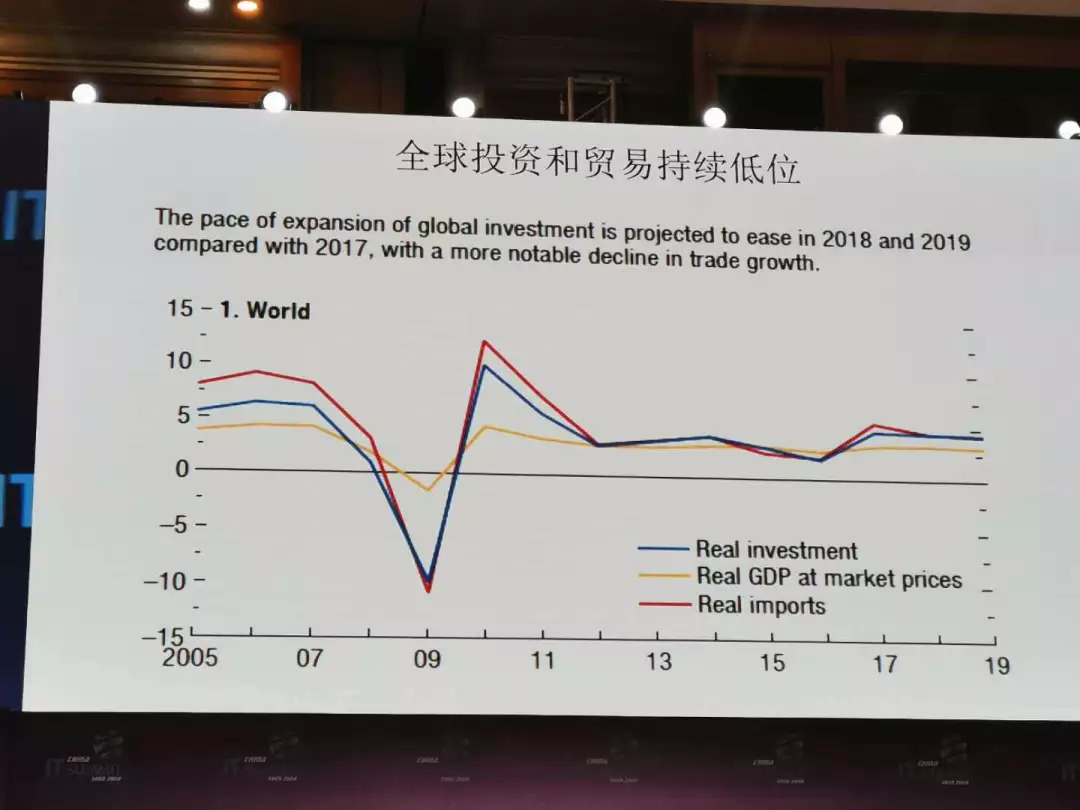 金融危机以来,我们看到全球经济增长有一个反弹,反弹以后一直在中低速增长。过去10年全球经济增长速度低于危机前的经济水平,今后两三年经济会持续缓慢的下降,这是全球经济的一个大的趋势。