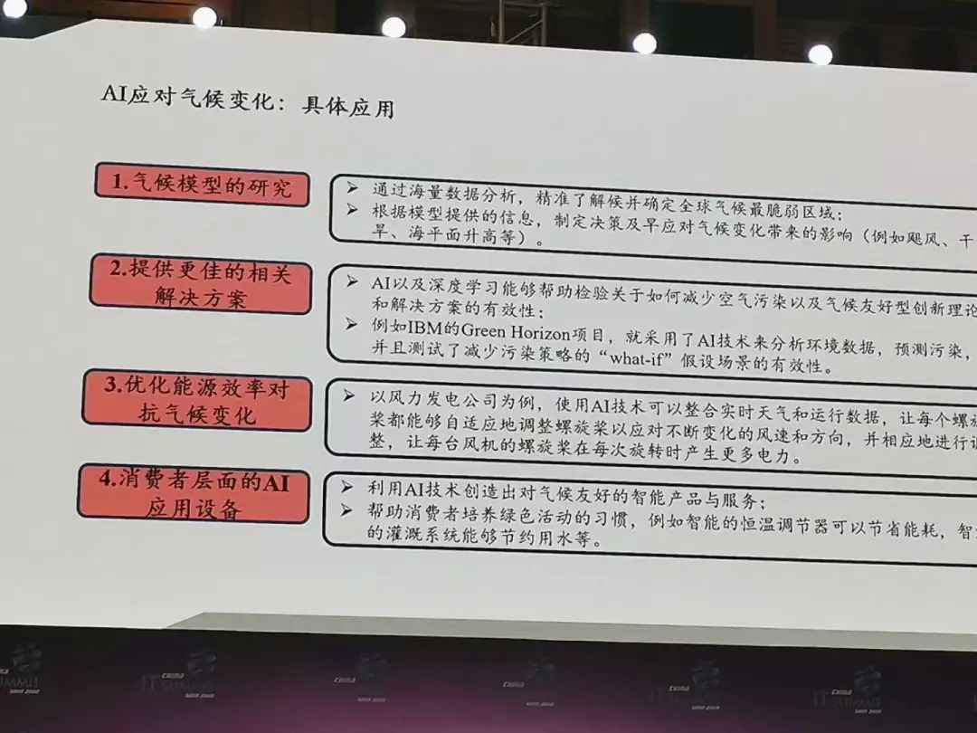 人工智能对气候变化影响很大,气候模拟分析提供更佳的气候解决方案,能源效率提高。我们发现人工智能能更准确地预测气温,温度的变化能够控制空调的变化,通过温度来改变每一个大楼的空调,这就是了不得的事情。