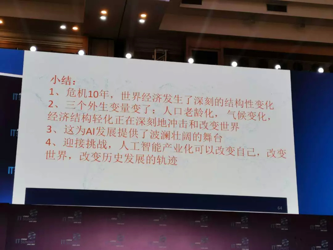 把所有的内容总结一下。危机十年,世界经济发生了深刻的结构变化;人口老龄化、气候变化、经济结构轻化这三个外生变量正在改变世界,给人工智能提供了一个波澜壮阔的舞台;要迎接挑战,人工智能可以帮助这些行业解决它的问题,同时在这个过程里得到自己的发展,改变这些行业,也由此改变历史的进程。