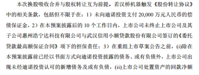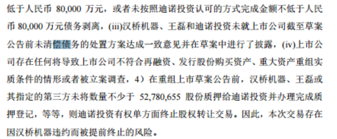 公告中指出,本次换股吸收合并与股权转让互为前提。若汉桥机器触发《股份转让协议》中的相关条款,包括但不限于在:1)未向迪诺投资支付20,000万元人民币的偿债保证金,2)在本预案披露后的10个工作日内,上市公司未终止上市公司及其子公司惠州浩宁达科技有限公司与武汉信用小额贷款股份有限公司签订的《委托贷款最高额保证合同》项下的担保责任等另两项要求,则迪诺投资有权单方面终止股权转让交易。因此,本次交易存在因汉桥机器违约而被提前终止的风险。