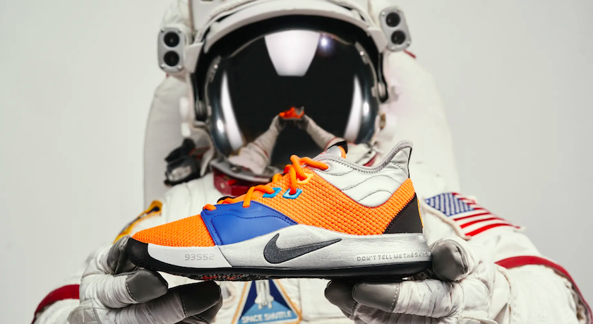 这不是PG3第一次和NASA搭上关系。今年1月,耐克就推出了首款PG 3和NASA的联名款球鞋。鞋身的设计和色彩灵感来自位于保罗乔治的家乡加州帕姆代尔市的NASA阿姆斯特朗飞行研究中心,鞋跟部位有NASA的Logo图标,还写有保罗·乔治本人最喜欢的一句话:“别跟我说天空才是极限,因为人类都已经上月球了(Don’t tell me the sky’s the limit when there are footprints on the moon)”。搭配着这双球鞋,耐克还推出了包括T恤、帽子、裤装和背包等同系列服装配件。