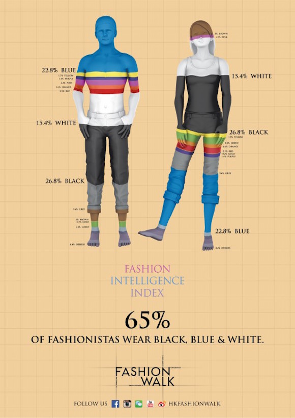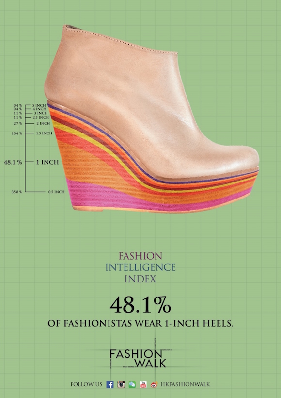 调查活动在周六、日进行,跨度是两个星期。除了记录潮人的衣着颜色和样式,活动还测量了潮人的鞋跟高度和包包重量,并对他们的生活态度进行了调查。结果发现,有八成的潮人从来不节食(这不科学!)。
