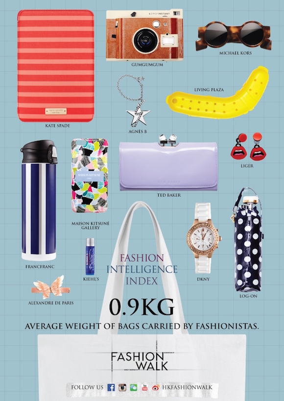 潮人上街背的包包平均重量是0.9公斤,相当于三瓶易拉罐装的可乐。包内常备的东西是钱包、唇膏、墨镜和雨伞。潮人们最爱的配饰为太阳镜、手镯、手表和戒指。