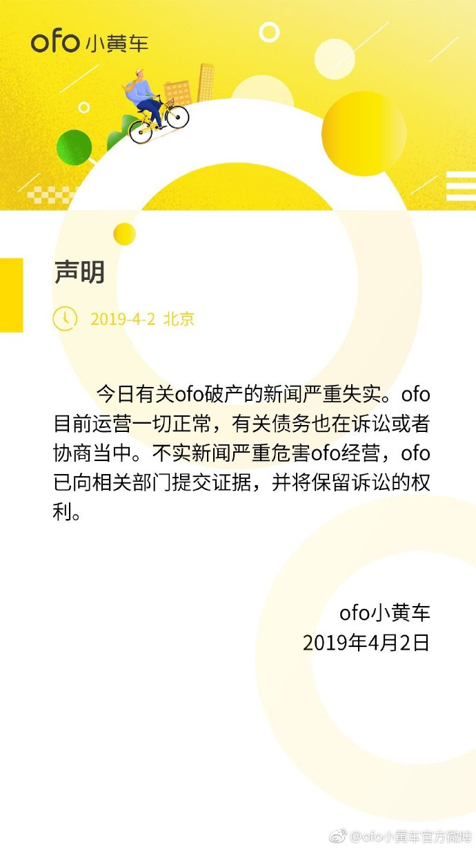 ofo回应破产传闻:消息严重不实,目前运营一切正常,有关债务也在诉讼或者协商当中。此前媒体报道称,ofo运营主体拜克洛克首次现身全国破产信息网。