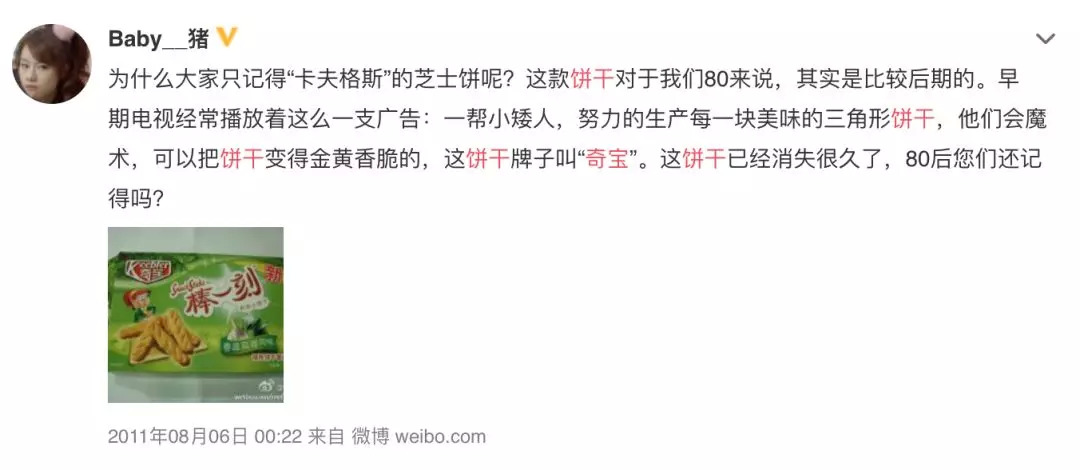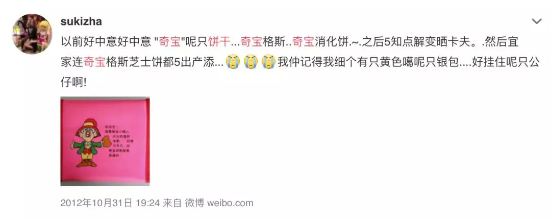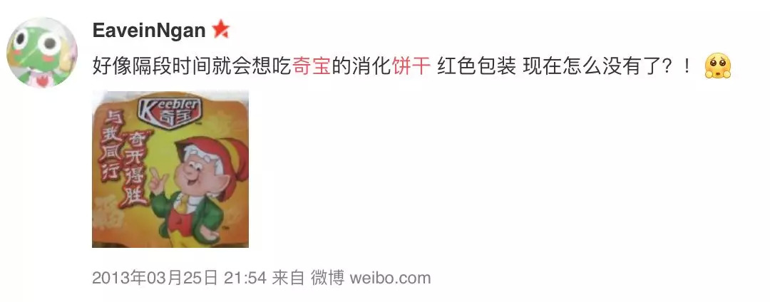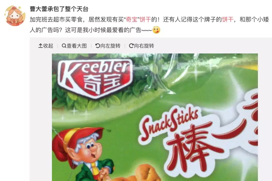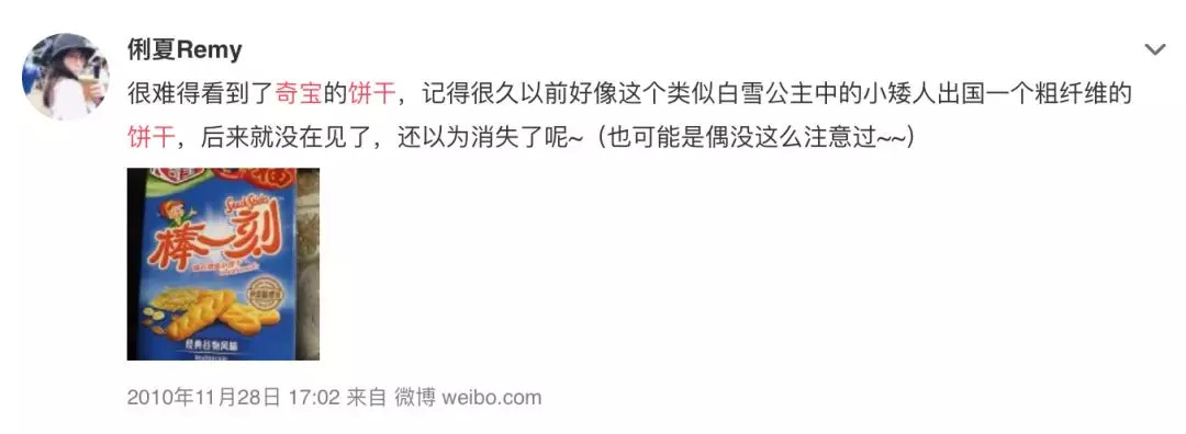 这一饼干品牌相信是部分80后中国消费者的童年回忆,尤其是在华南地区。今天,小食代在新浪微博上搜索看到,不少网友们提起奇宝都说是“小时候的味道”。