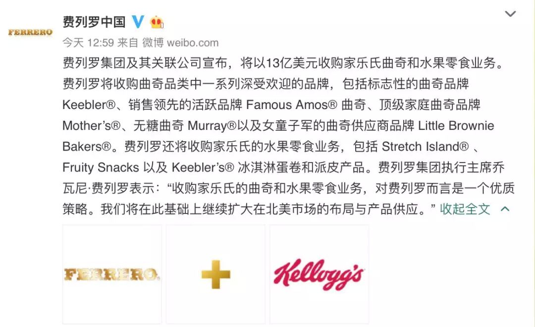 昨日,全球第三大巧克力糖果制造商、意大利糖果巨头费列罗集团及其关联公司(以下统称 “费列罗”)宣布已签订一份最终协议。根据该协议,费列罗集团将以13亿美元(约合人民币87亿元)收购家乐氏曲奇和水果零食业务。这些业务在2018年的销售额达9亿美元(约合人民币60亿元)。