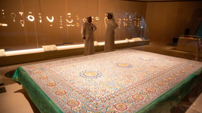 游客还可以看到19世纪的巴罗达珍珠地毯,绣有超过150万颗海湾珍珠,并饰有祖母绿,钻石和蓝宝石。