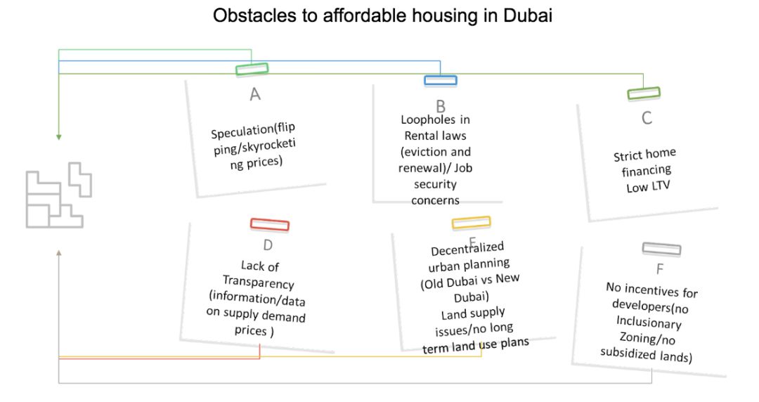 造成迪拜经济适用房问题的一个主要原因是它被投机者所操控。从2003年到2015年,这些投机炒房者把公寓和别墅的价格分别抬高了3倍和5倍,使普通人难以买房。潜在购房者和租户没有经济实惠的选择,只得把超过41%的收入花在住房上。