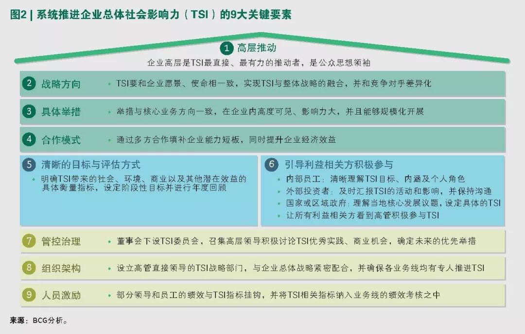 加强总体社会影响力最有效、同时也是最具挑战性的途径,是利用企业的核心业务,创造可持续的规模性社会效益方案。BCG基于过往大量的相关项目经验,提出了系统推进企业总体社会影响力的9大关键要素(参阅图2),帮助企业有效降低负面事件发生的概率,为企业带来新的发展机遇,从而提升长期股东总回报,在多变的市场竞争中实现基业长青。