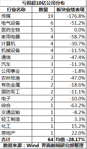传媒行业是巨额亏损的聚集地,共有19家呈巨幅亏损。电气设备、医药生物、家用电器及计算机行业次之。