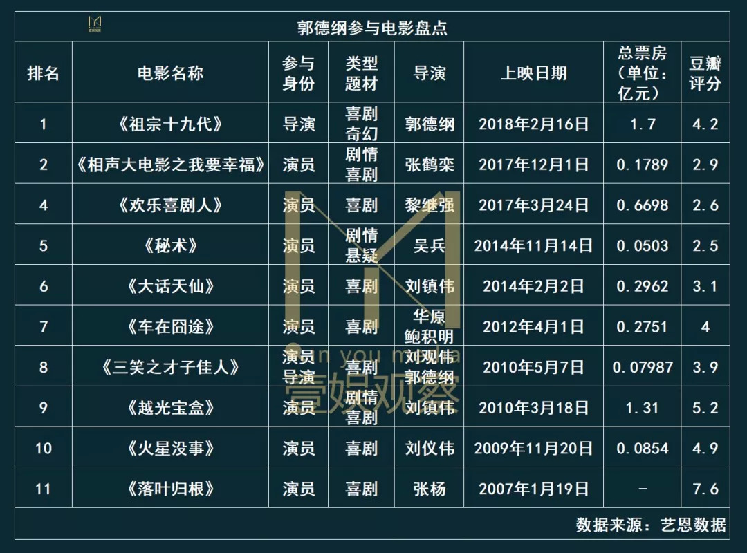 直到现在,郭德纲还是会时不时出现在银幕上,可是就近两年的数据来看,无论是2017年票房并未过亿,豆瓣评分也都未超3分的《欢乐喜剧人》和《相声大电影之我要幸福》,还是2018年自导自演,豆瓣评分4.2的《祖宗十九代》,都可以从一个侧面看出,郭德纲在电影上的表现,似乎并没有他在相声界那样风生水起。