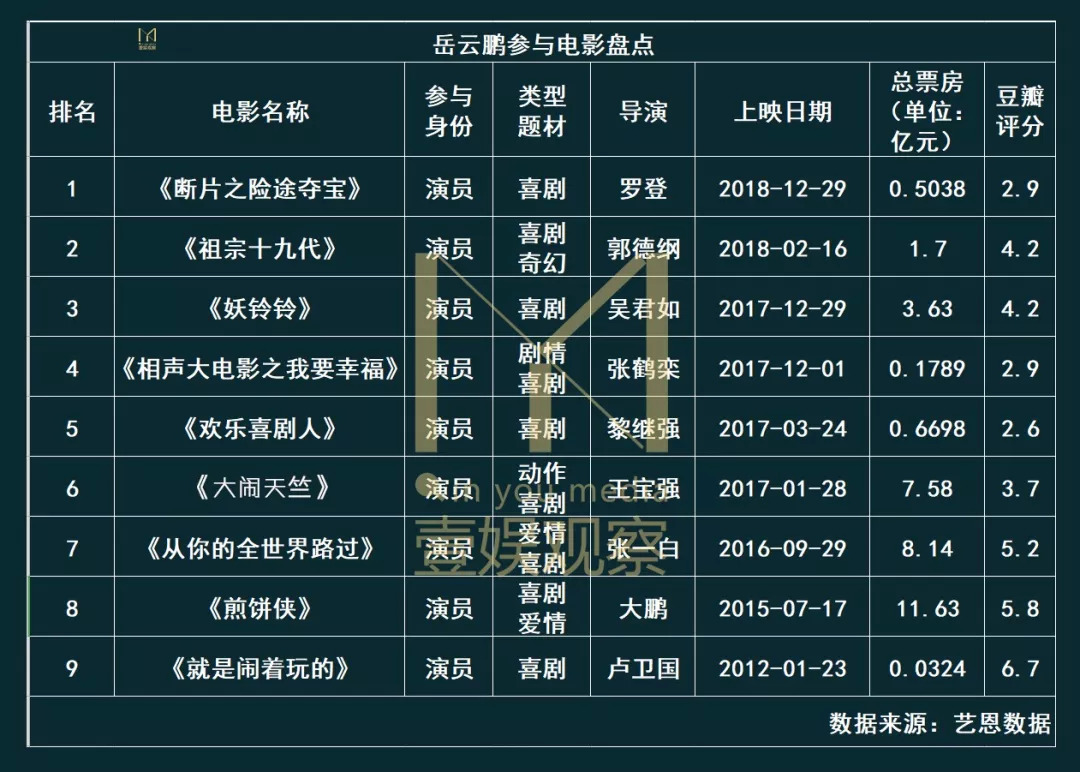 就拿近两年的作品来说。2017年,岳云鹏就参演了4部电影,到了2018年,他又参与了师傅郭德纲导演的《祖宗十九代》,在2018年的跨年档,也和著名的喜剧演员葛优共演了《断片之险途夺宝》,虽然从艺恩数据来看,两部电影的豆瓣评分分别为4.2与2.9,票房成绩也不甚理想,但无论如何,岳云鹏达到了在银幕上维持曝光度的目的,在电影领域始终占有一席。