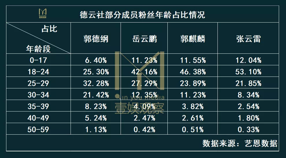 从艺恩数据中我们可以发现,郭德纲、于谦等老一辈,包括中坚一代的岳云鹏,其粉丝年龄及性别构成中,男性占比明显大于女性,且在18-34岁三个年龄跨层中的分布较平均。而郭麒麟和张云雷这一批年轻一辈,则女性占比明显大过男性占比,且年龄构成大多集中在18-24岁的受众群体。