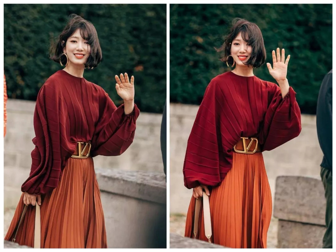 朴信惠时装周刚穿了一条,来自2019 春夏系列。标志性压褶、宫廷风主教袖,配上Valentino专属红色,高贵典雅~