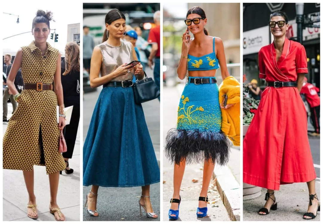 即使像时尚编辑Giovanna Battaglia这种身高条件不错的,穿长裙、中长裙这类大量感单品时,为了避免压个子,同样需要用腰带提高视觉重心。