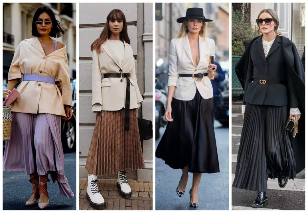 今年还特别流行西装+百褶裙组合,容易显矮,但系一根腰带就会好很多。