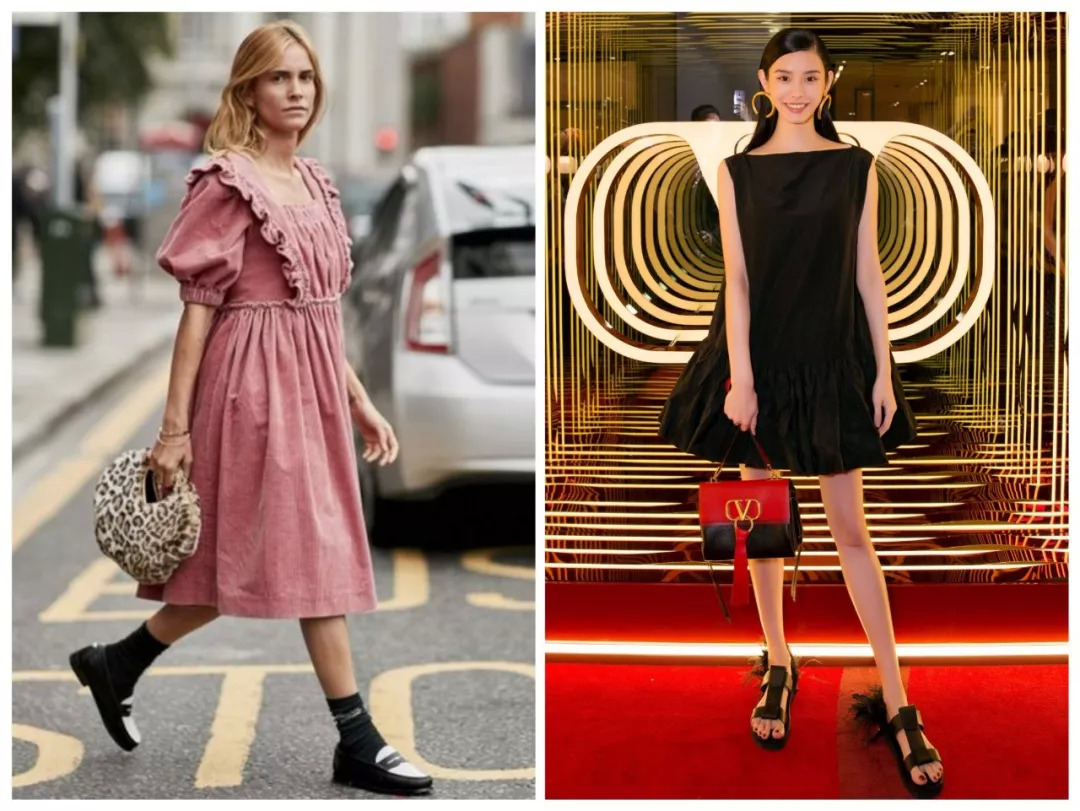 还有今年流行的宽松娃娃裙,最大的bug就是没腰线,穿不好像孕妇。连奚梦瑶都中招