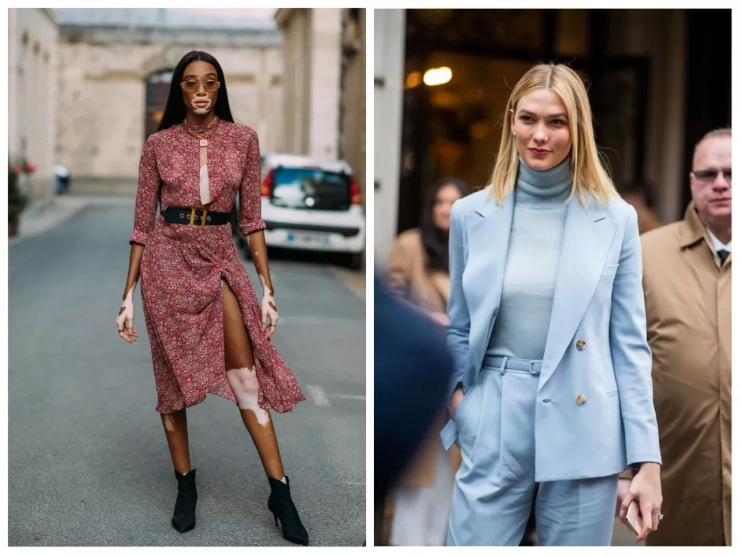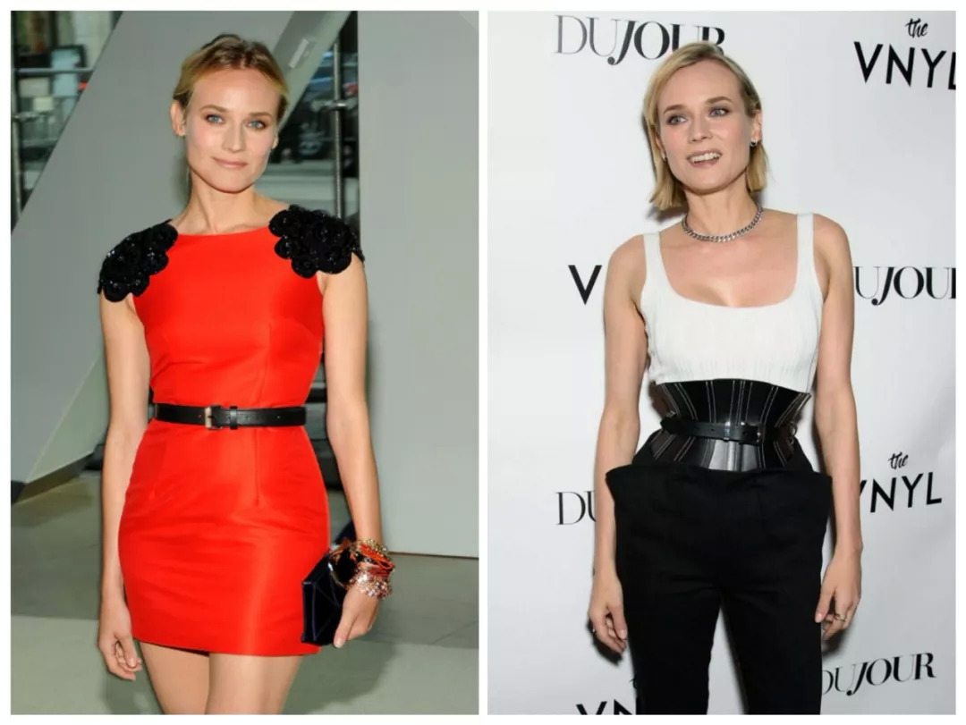 此外,宽腰带里有一种特别推荐——上下宽,中间窄,像沙漏一样。正常腰围的戴安·克鲁格系上(右),小蛮腰都惊为天人!