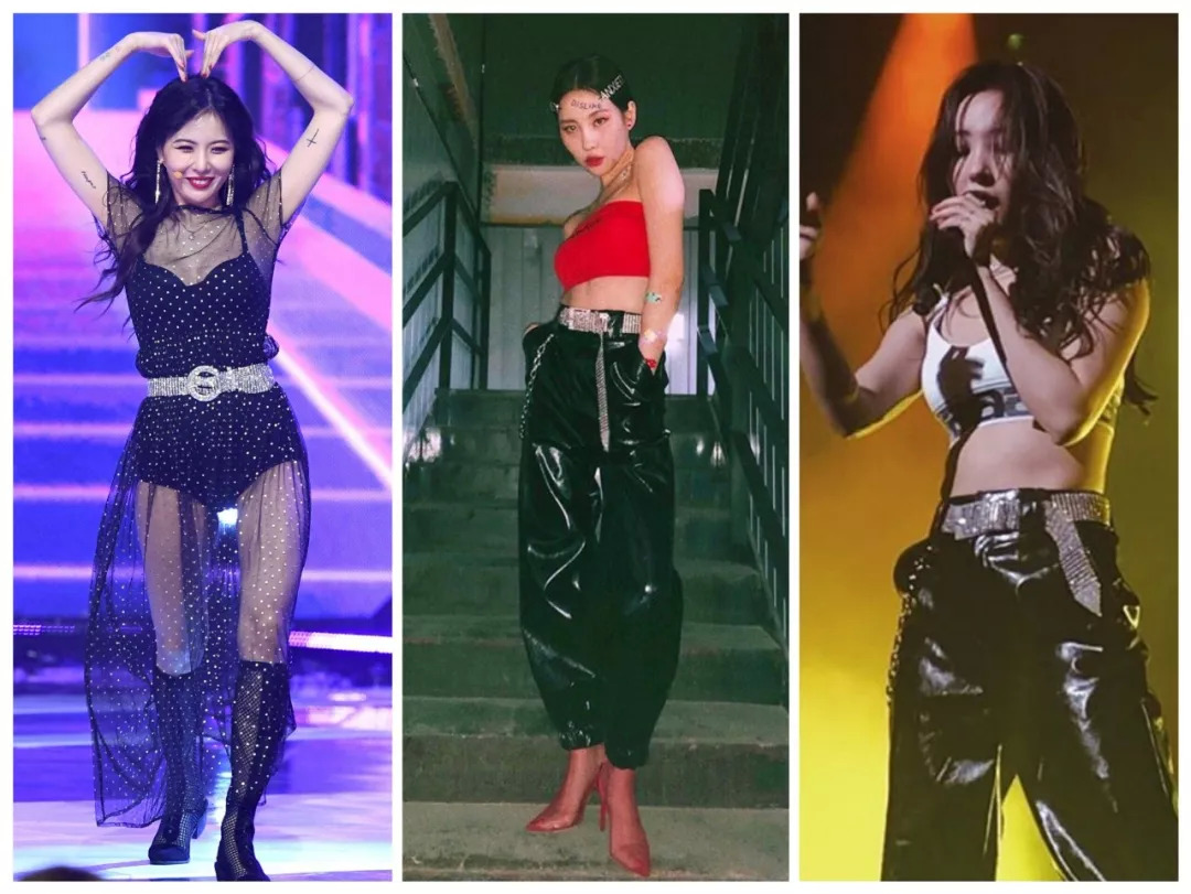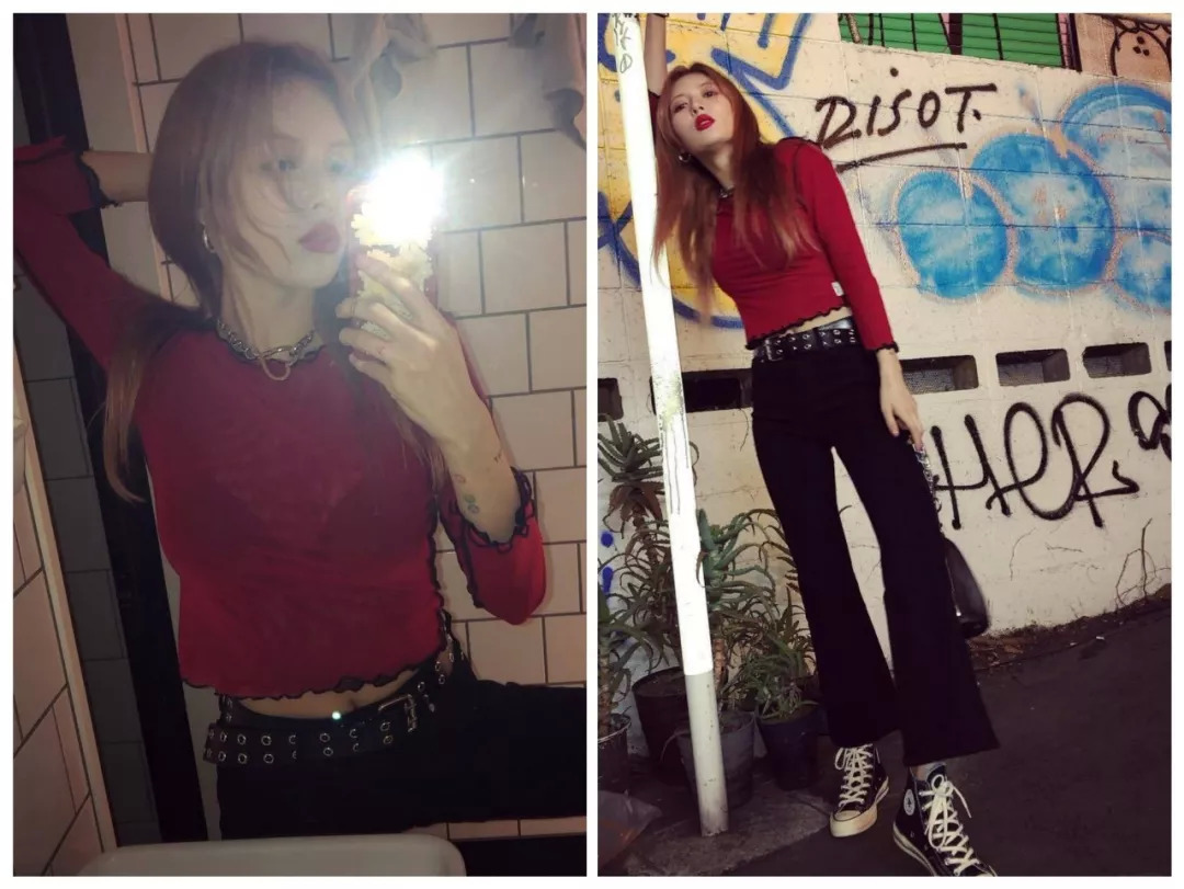 喜欢摇滚、街头感的姑娘,千万别错过铆钉腰带!泫雅就有一条,相当帅气~