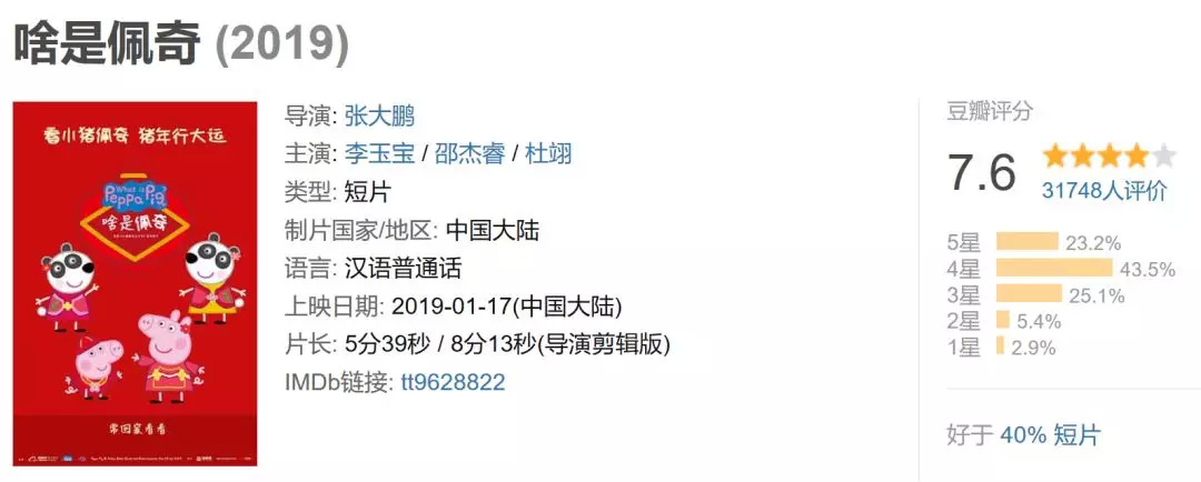 2019年,《啥是佩奇》成为开年首个在各大互联网社交平台刷屏的案例,短片走心的内容成功带动“自来水”传播,“硬核佩奇”获赞。在豆瓣上,《啥是佩奇》的评分高达7.6分,在优质的营销内容驱动下,《小猪佩奇过大年》成为春节档首部出圈的作品。