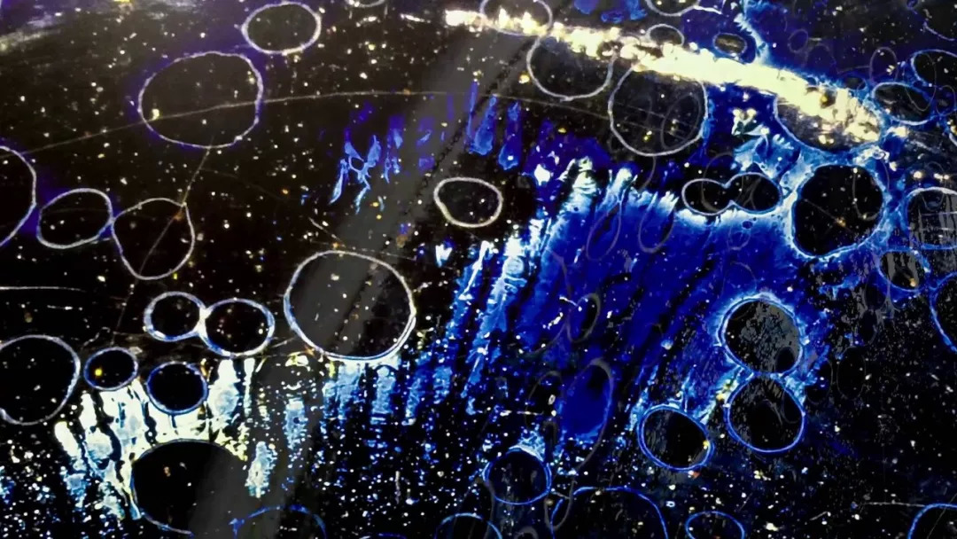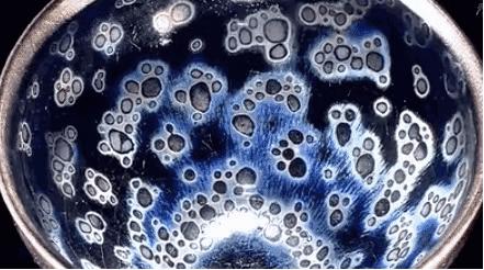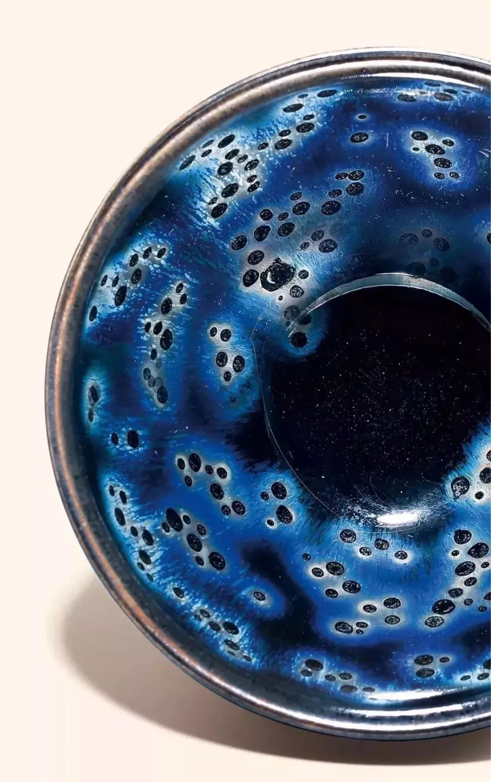 「曜变」是建盏中可遇不可求的宝物,所谓曜变,就是在黑色的底釉上聚集着许多不规则的圆点,圆点呈黄色,其周围焕发出以蓝色为主的,宛如宇宙星云般深邃绚丽的耀斑和光晕,妖异瑰奇得不像是人间之物。