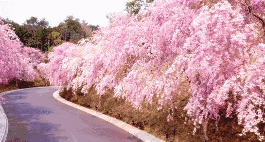 枝垂樱步道长约二百米,是缓缓的上坡路,两旁花团锦簇,低垂花枝摇曳生姿,形成了壮阔的樱花瀑布。