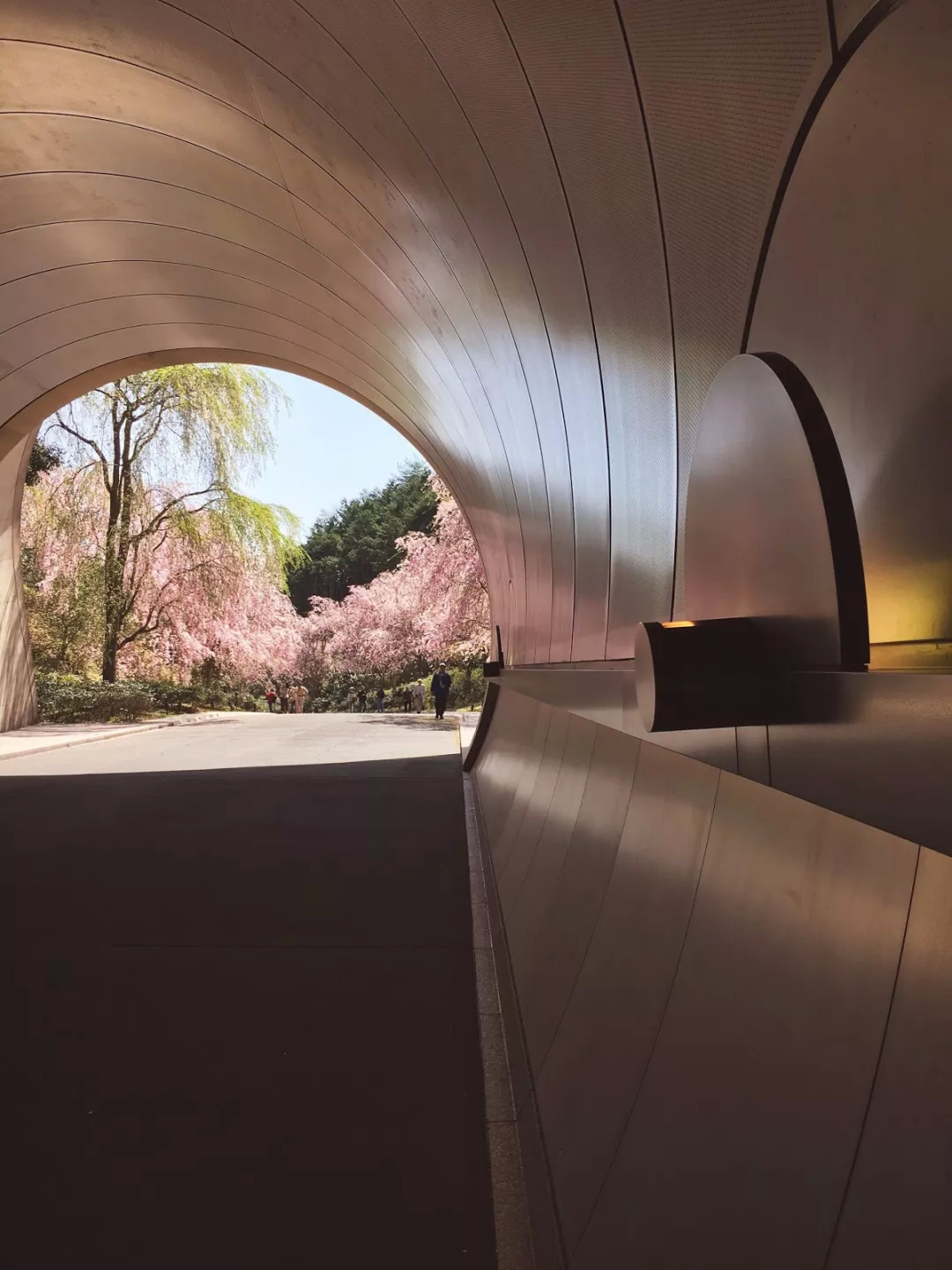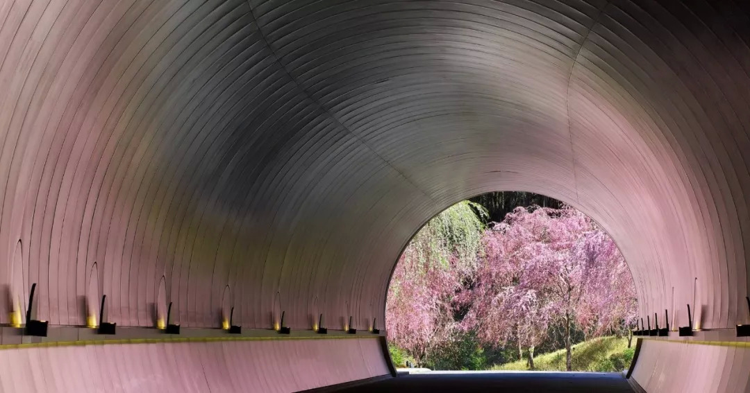 最妙的是,隧道内墙是由独特的铝质建构而成,因光线而反射出洞口外的樱景,让隧道笼罩在一片淡粉色的光晕之中。